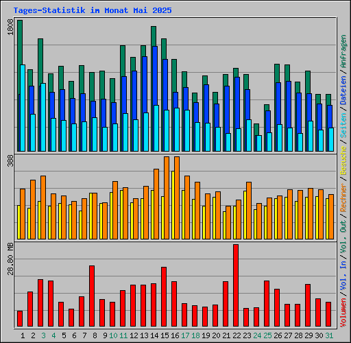 | Tag | Anfragen | Dateien | Seiten | Besuche | Rechner | Volumen | Vol. In | Vol. Out | ||||||||
